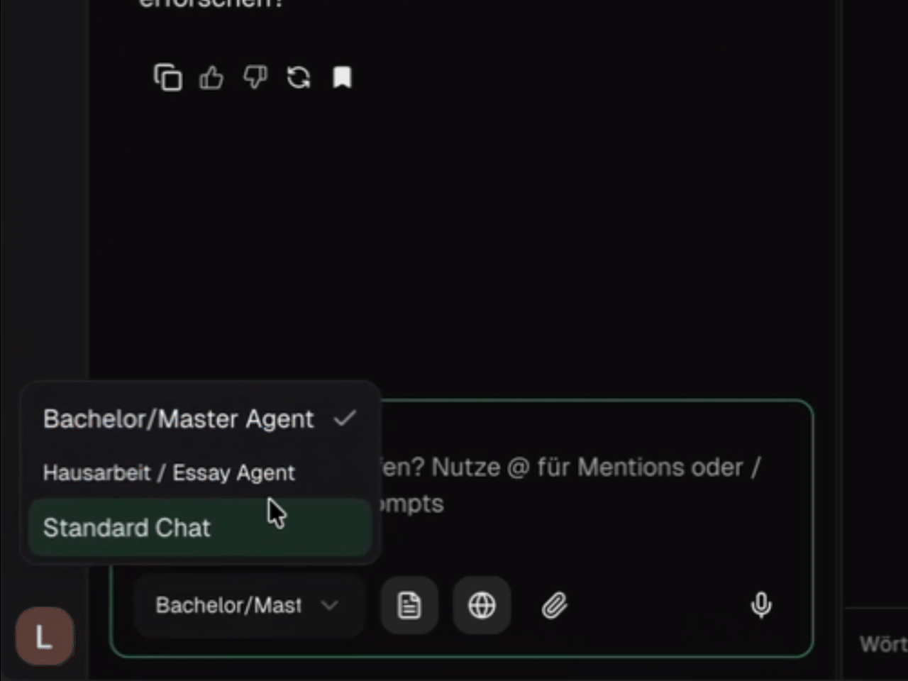 Chat with specialized AI agents for your research papers. The Bachelor/Master agent guides you step by step through literature research, methodology development and writing process.